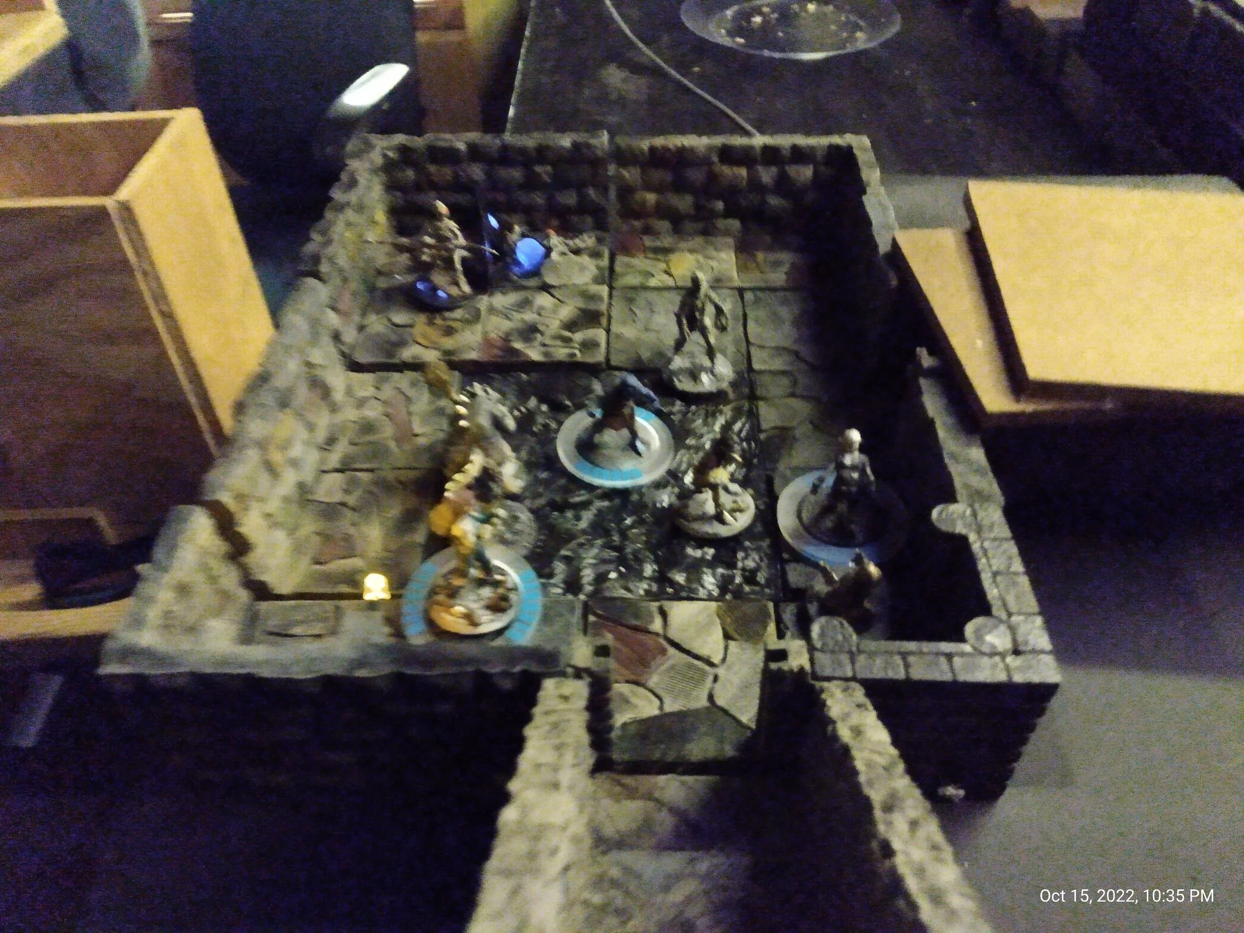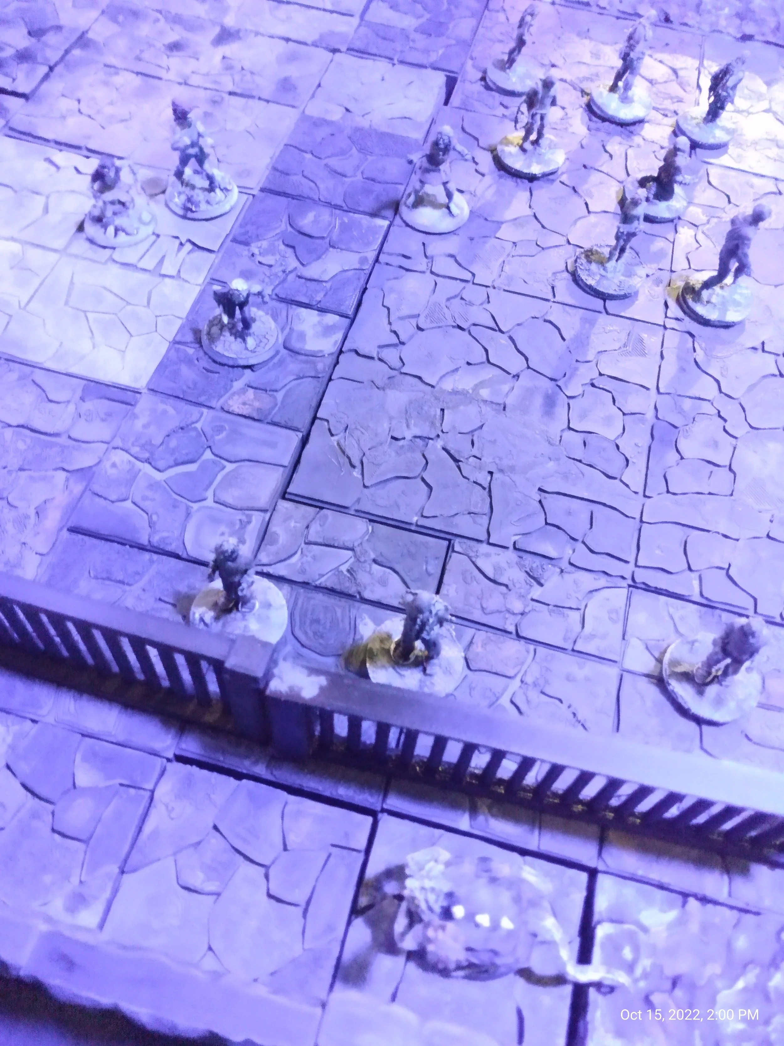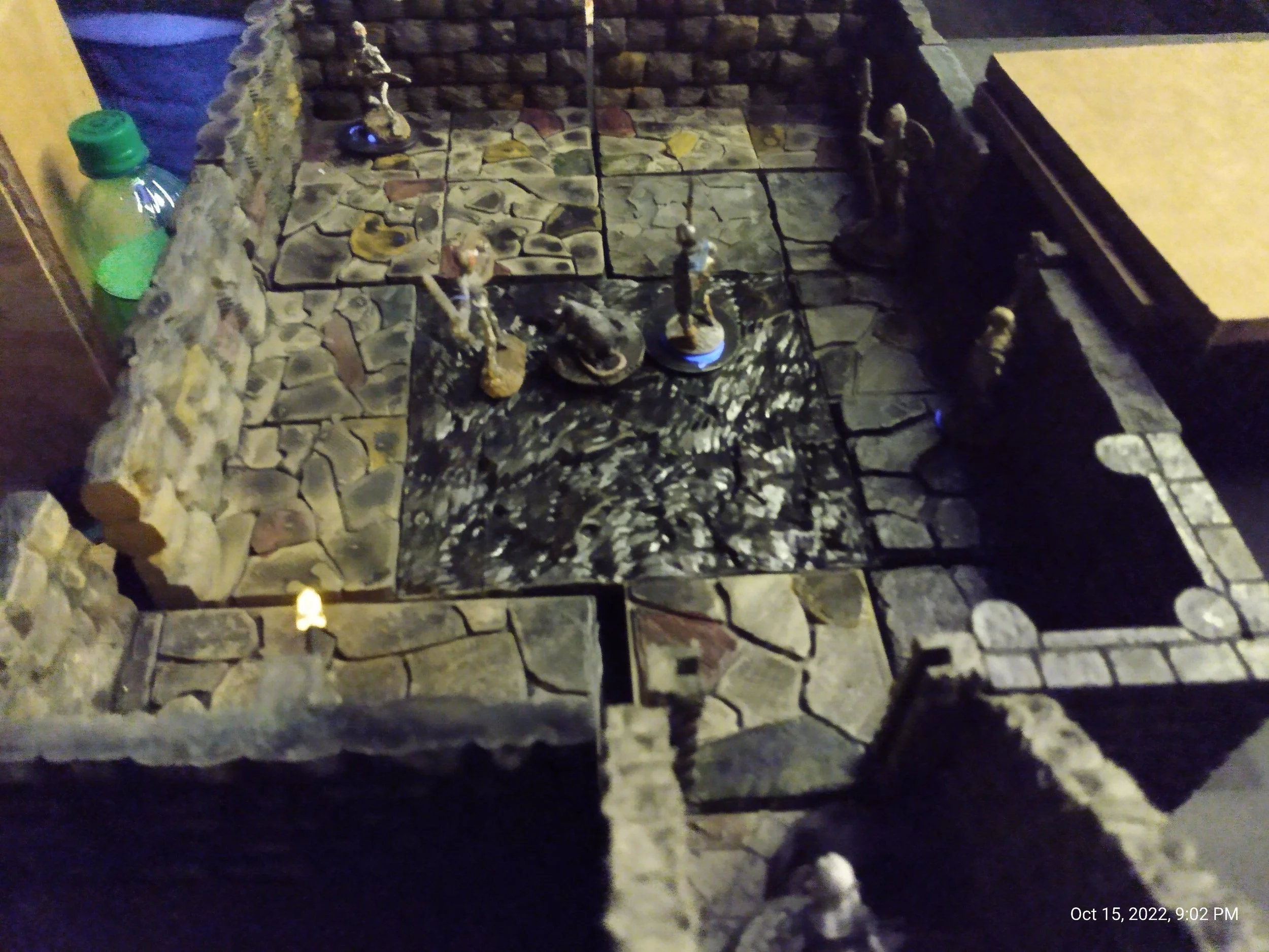 We stood in the hall and discussed. Oberon and Pinroy wanted to go back and take the other room with the skeleton footprint and Ronyn and I wanted to continue forward and create a bottle neck and take the skeletons one on one. We heard pounding coming from behind us…from the closed room. Wave suddenly barreled passed us and throws an acid splash in the room and one of the skeletons kicked the rat straight at Wave’s face. There is only room for him and Oberon on the stairs and we will have to deal with whatever is coming behind us. One of the red rags stands fast and Ronyn and I prepare the Black Widow if he goes down.