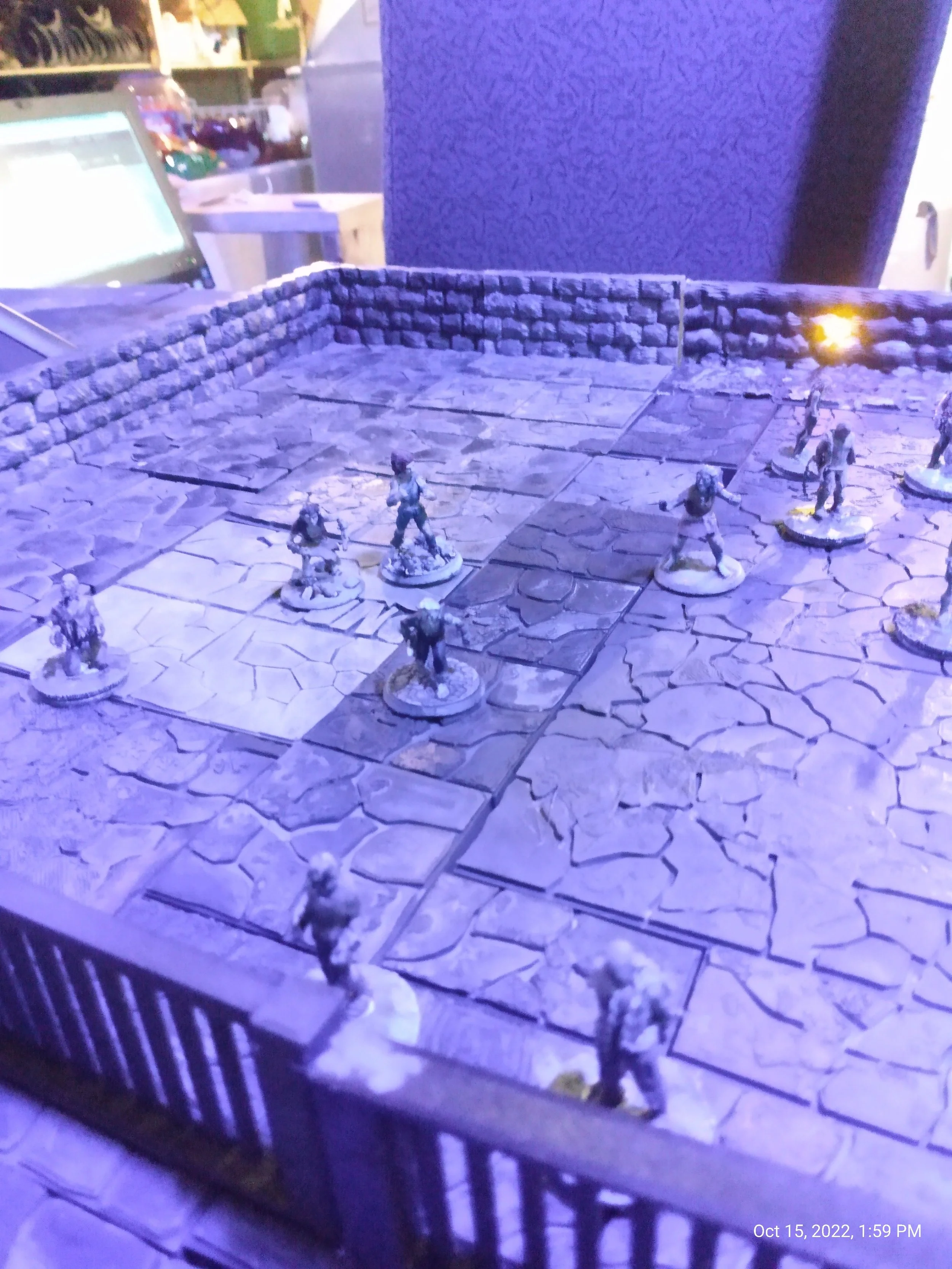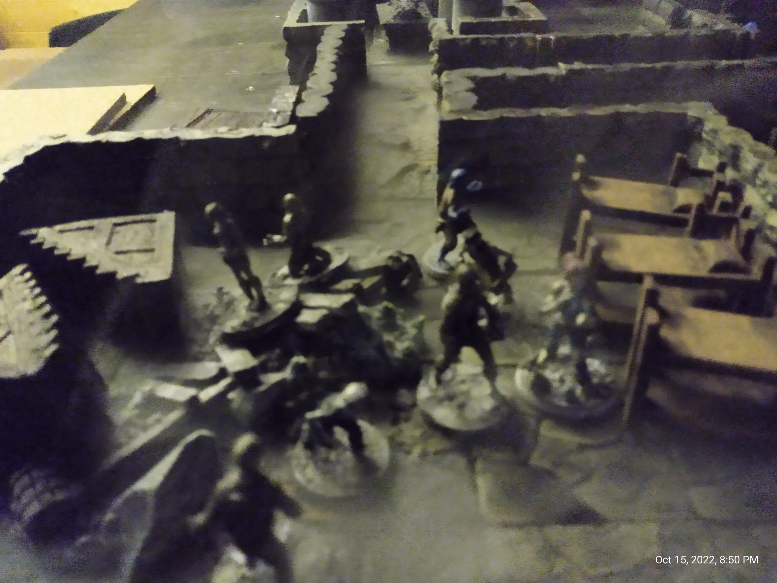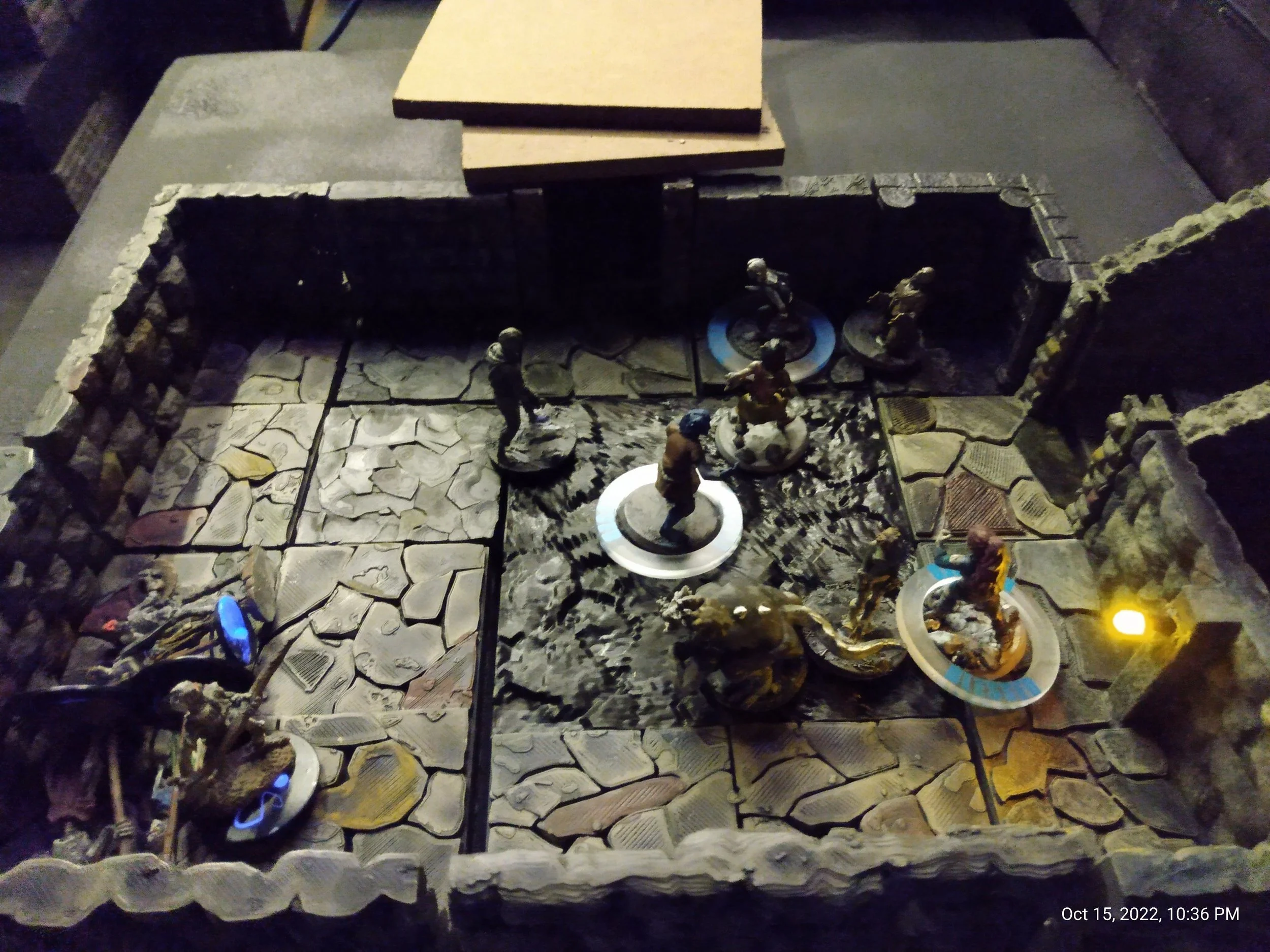 We stood in the hall and discussed. Oberon and Pinroy wanted to go back and take the other room with the skeleton footprint and Ronyn and I wanted to continue forward and create a bottle neck and take the skeletons one on one. We heard pounding coming from behind us…from the closed room. Wave suddenly barreled passed us and throws an acid splash in the room and one of the skeletons kicked the rat straight at Wave’s face. There is only room for him and Oberon on the stairs and we will have to deal with whatever is coming behind us. One of the red rags stands fast and Ronyn and I prepare the Black Widow if he goes down.