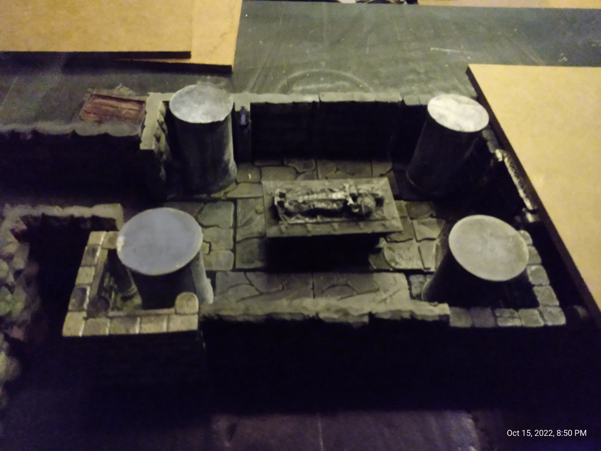 We headed down a hallway and came to a T-junction. Oberon noticed something odd in one of the walls and called the miner who came with us. He noticed a loose brick and when he pulled it out there was an ornate gold box. Oberon said it was the name of the dragonborn whose box it probably was – Sesters Silktongue. I opened it and, in the velvet, lined box was an ornate golden dagger – not great for fighting and really wished it was an iron dagger, but if we ever get out of here it will fetch a pretty penny. Beside the dagger there was 30 gp, 50 sp; 30 cp and a small gem. We had no time to care about gems and coin. I stuffed it in my burlap sack, and we went right. We came to a door that looked as if it had sunk into the floor. There was an opening above it. Ronyn alley-ooped me in and I saw four pillars and a stone sarcophagus with some fancy soldier carved on the top. I scrambled inside and Ronyn soon joined me. While we pushed and the men pulled the door slid open.