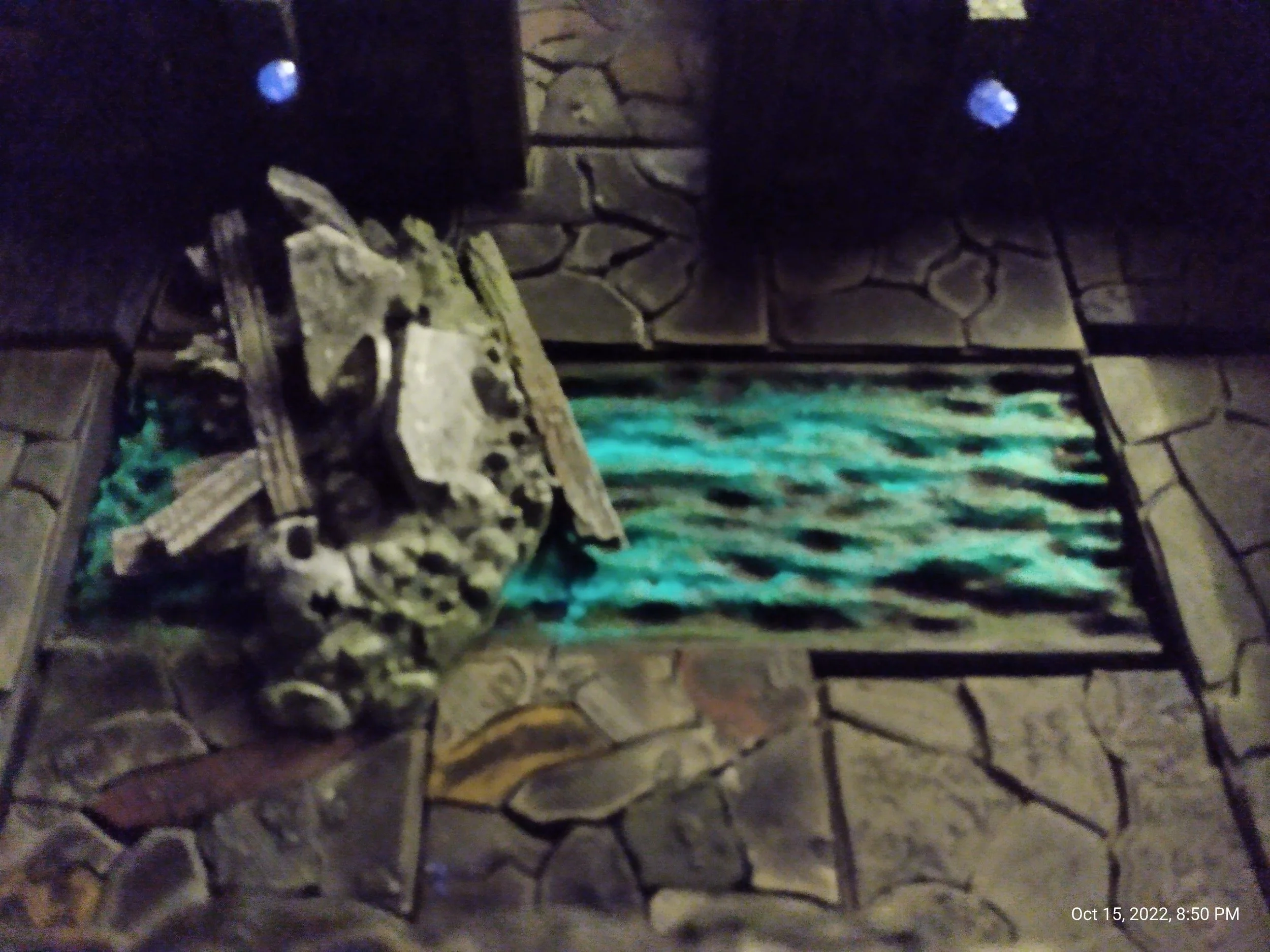 Oberon and one of his men were hurt and the dwarf miner was pulled under. I can only assume the creature ate him. Wave, who didn’t seem to mind the inky water dove under and we waited anxiously until he resurfaced and put 10 gems in front of us and dove down again and again and bringing up 5 gp, 30 sp; rusty set of chain mail; rusty hand axe; rusty short word; 2 rusty pickaxe heads; 2 pieces of a long sword; war pick head.