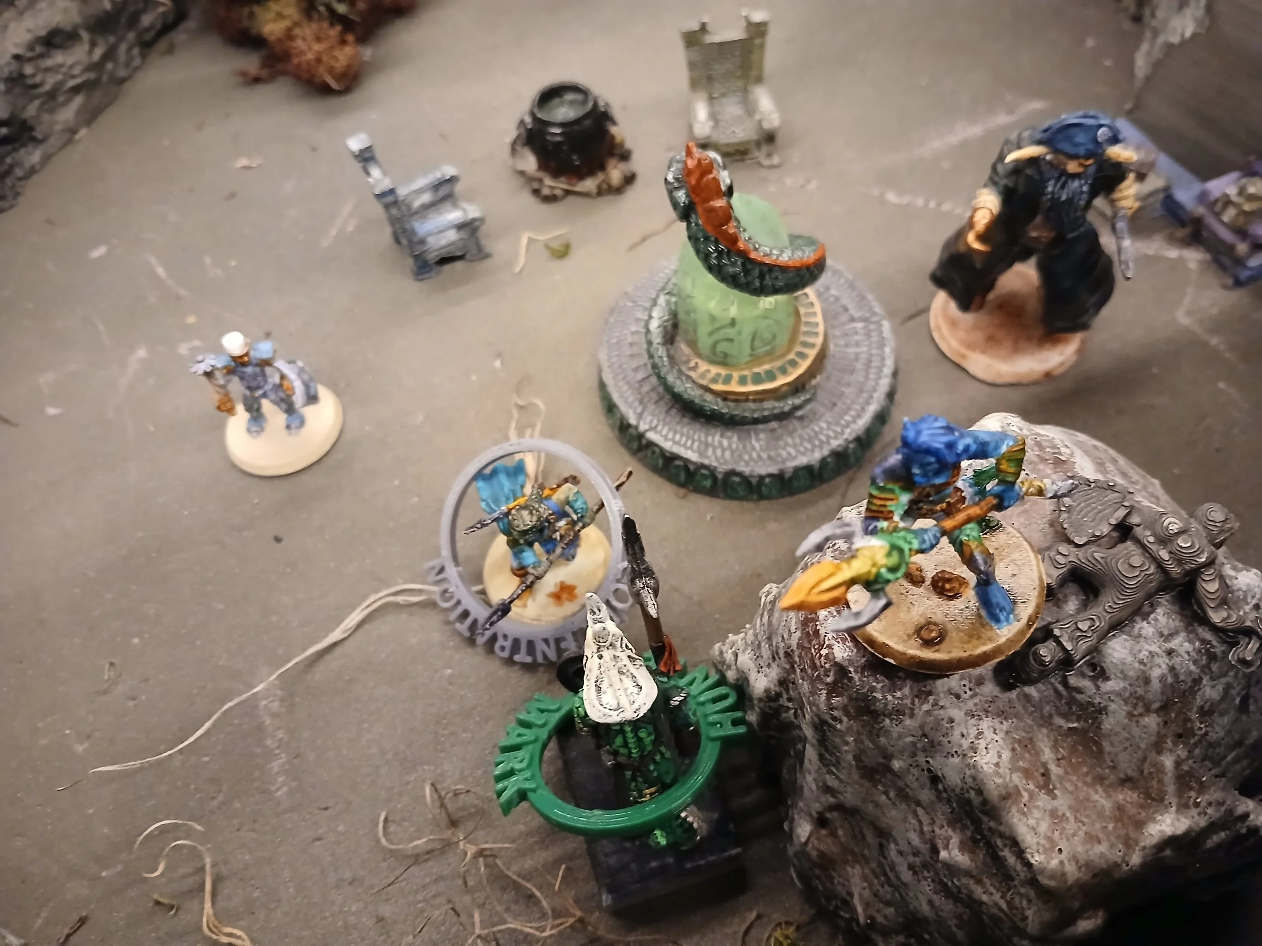 Before Roku can perform his rites, another lizard creature jumps out at us – another of these skull helmet creatures. Truf and Culsruth lashed out, angered at finding another of their crew dead. We dispatched him and search the room. There is a box and chest. In the box is a small leather sack filled with gray sand – dust of track disappearance 3 uses. In the chest is a bone scroll tube – Speak with Plants – 250 gp, 3 med gems and a healing potion.