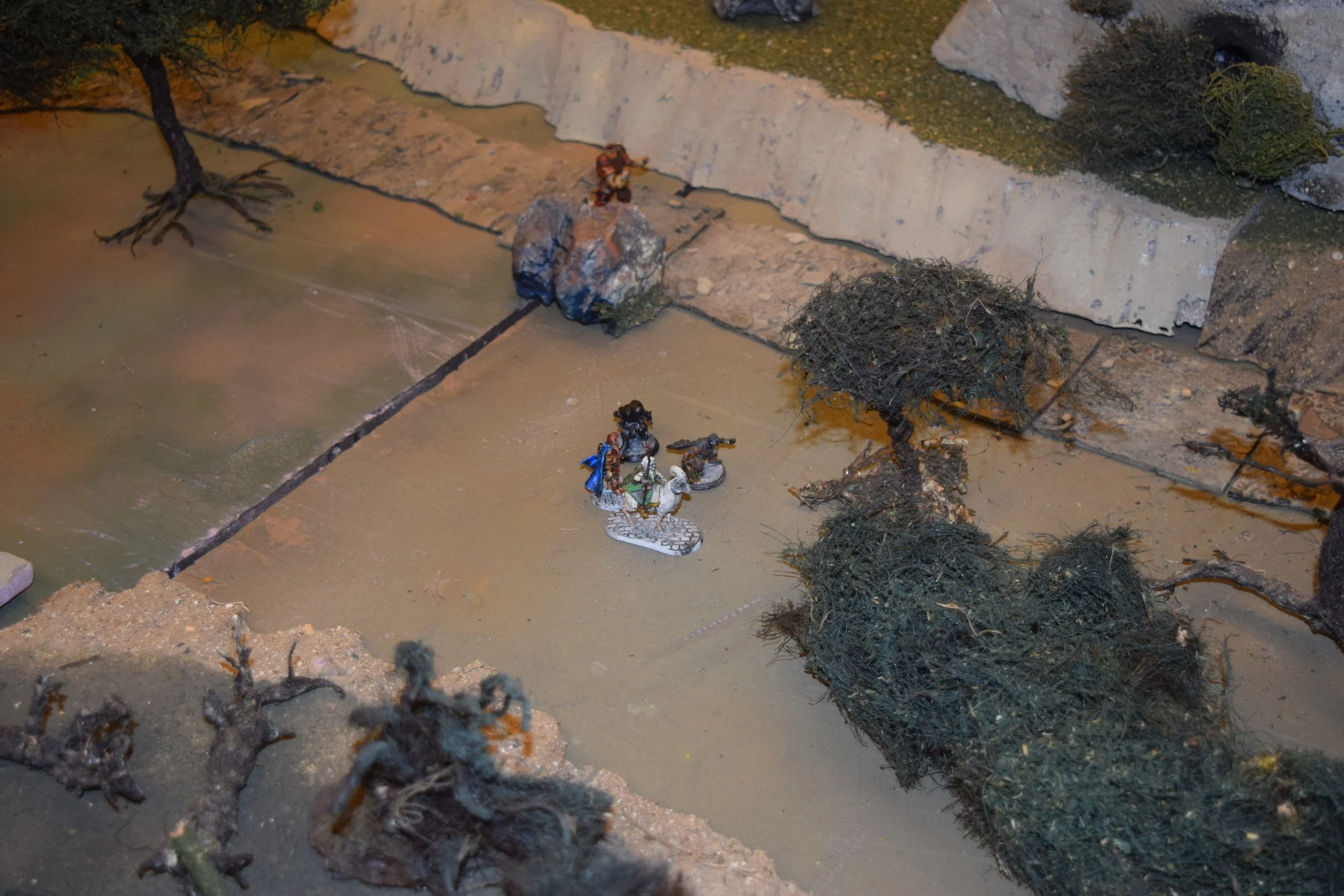 We continue down the road and see a crumbled ruin wall of an old check post, now being manned by three giants and another hag that we can only assume is Nada. Raelin moved first, darting forward, taunting and drawing away one giant and the hag herself.