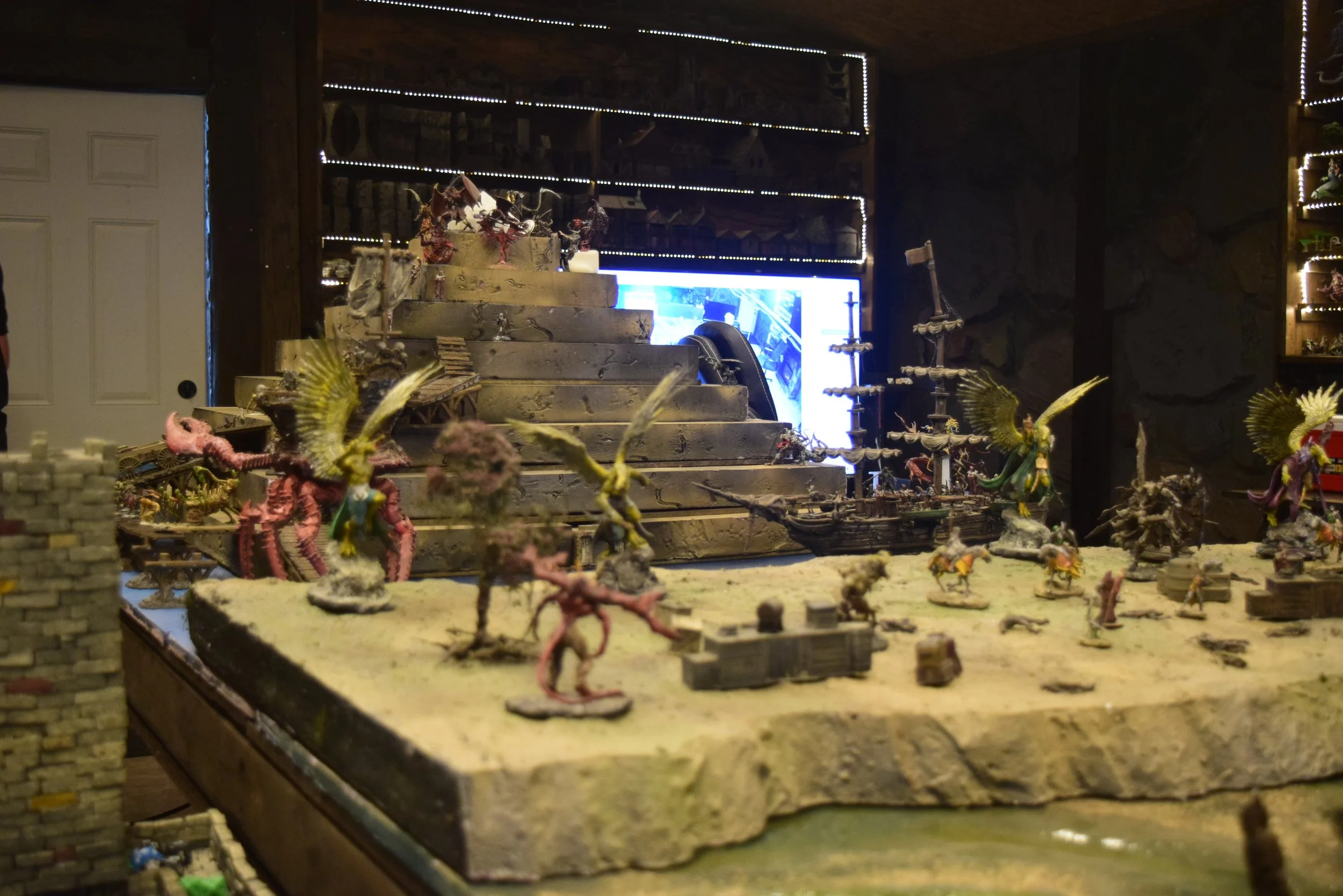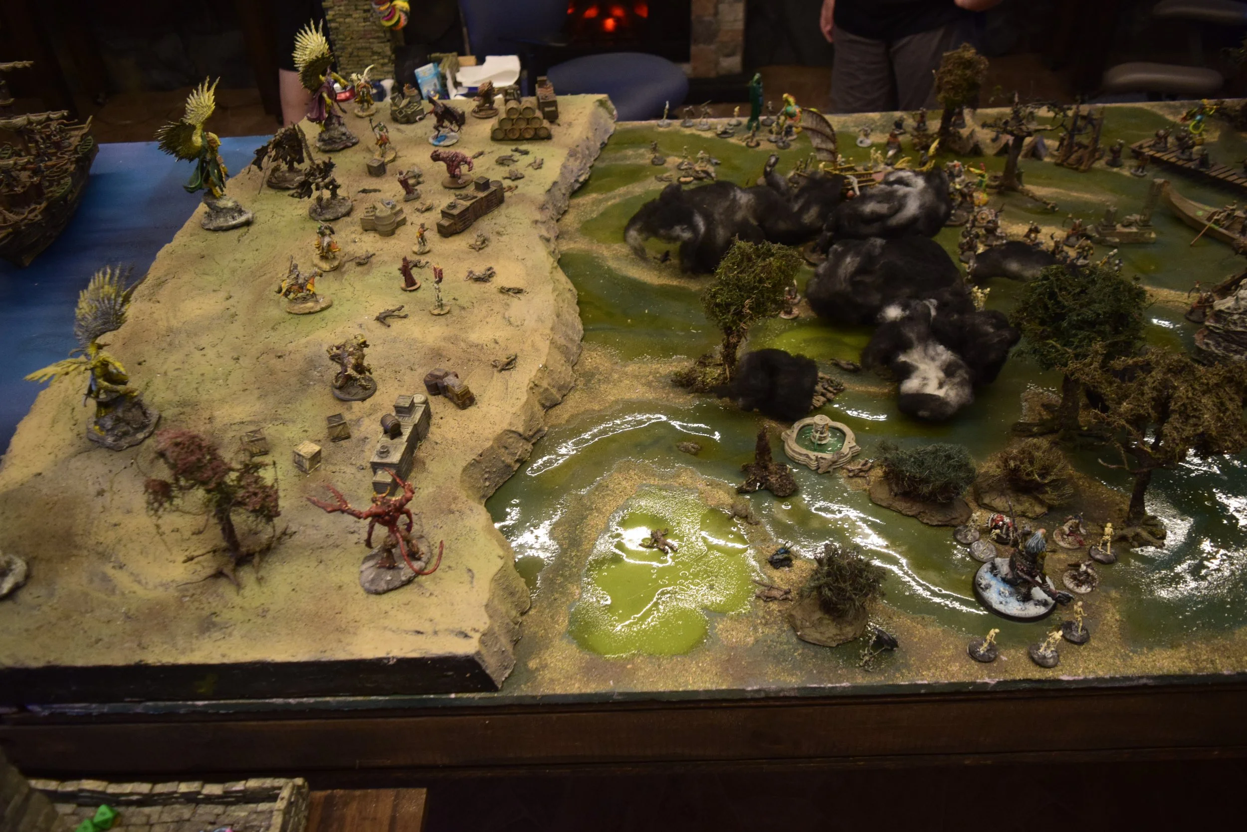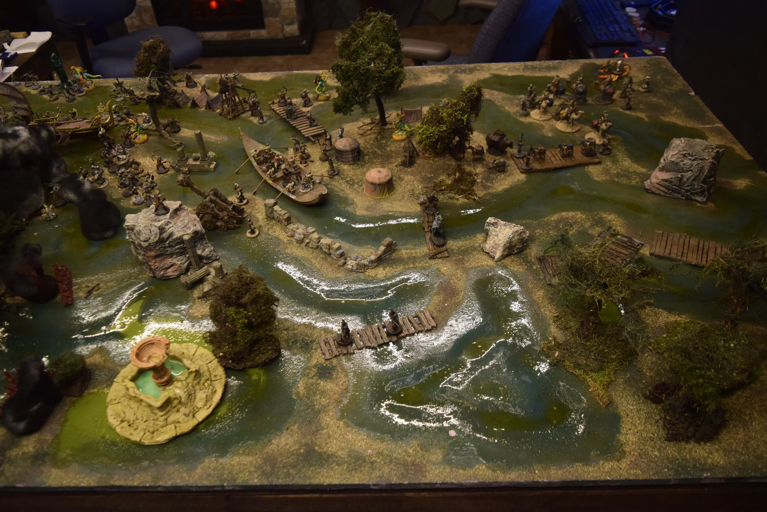 As we near Ram Module, the air becomes more humid, the ground swampy as if moisture is bubbling through the sand trying tor reclaim this land as jungle once more. Trees become more frequent, and we begin to hear the familiar sounds of battle. We arrive in what can only be called a marsh with trees and sandbars. Log-hewed bridges have been set up over the deeper patches of water and a large encampment of soldiers and adventurers. Further on a huge pyramid rises out of a lake and we can see the tall masts of ships. A huge battlefield divides us from the pyramid where men, elves, dwarves and bugbears seem to be fighting the dredges of hell itself. And in their midst tall bright green lizard folk that stand tall, not hunched like Pinroy. They are brightly adorning with feathers and leading them seems to the tallest with a large crown of red feathers on her head. “The red crested beauty,” Pinroy whispers.