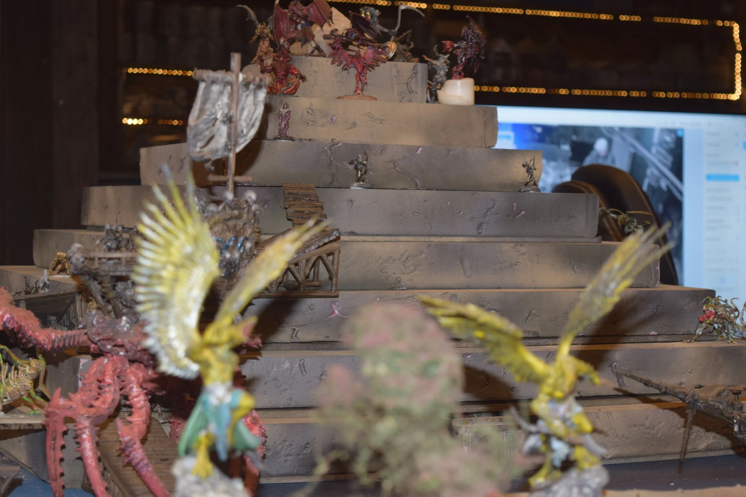 We take our leave of Pinroy’s goddess and fly over the battlefield heading straight to the pyramid. We fly over ships attacking in a harbor and Wave muses if one of those is the ship that we have the deed to. One ship is atop a giant crab as it clambers up the side of the pyramid.
