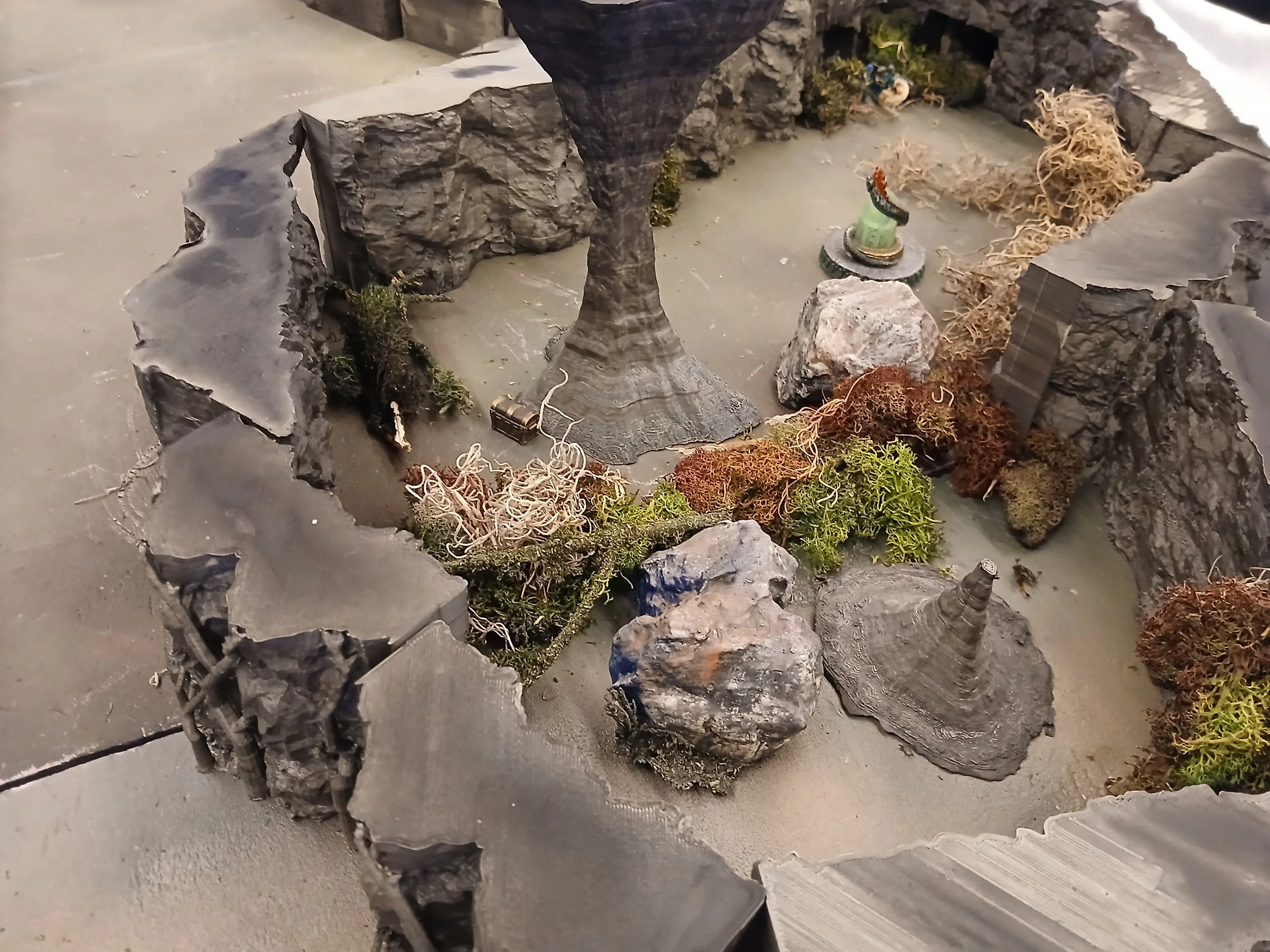 Once we were all across and squeezing out the excess water from our clothing and drying our weapons, Brother Genasi hushed us and bade us to listen. Far off in the distance we could hear wailing. We resumed our march and entered a cavern with a multi-headed snake statute – its beguiled eyes sparkling. Pew cried out “Shiny-nees” and flew over to stand on the head of one of the heads and peck at the eye. He cocked his head and then was perfectly still.